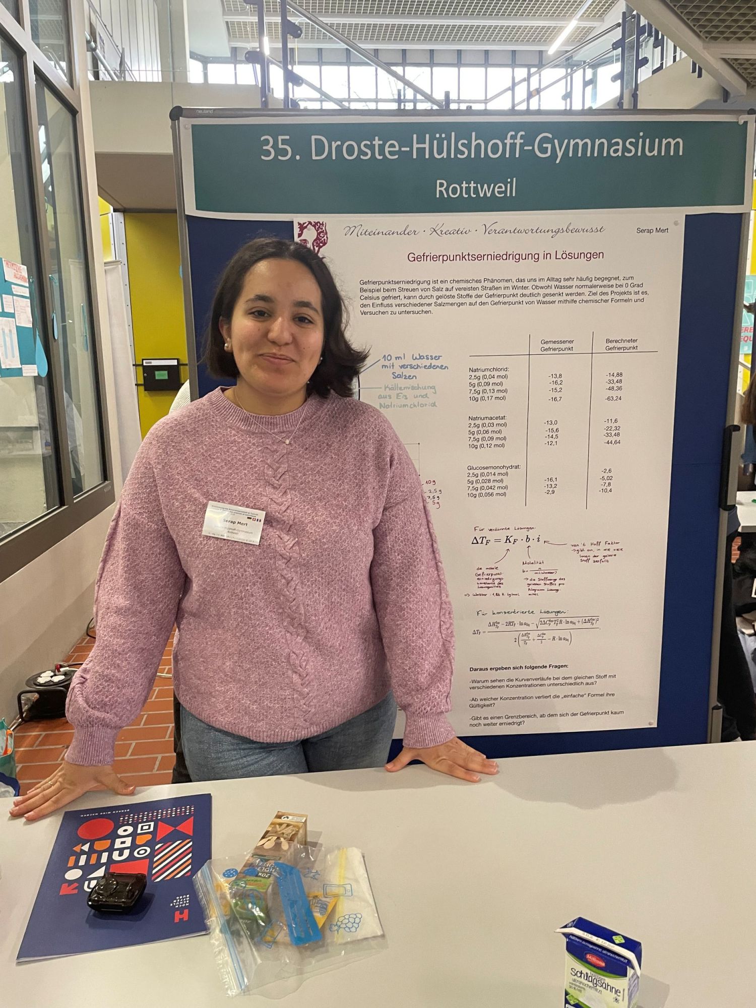 Zu den vorgestellten Projekten gehörten NWT-Facharbeiten, darunter „das anscheinend funktionierende Perpetuum-Mobile“ von Morien, „der Bier-o-mat“ von Julian G. und „Steuerungstechnik Pneumatik“ von Damian. Sofie und Julian präsentierten ihr Projekt „Kunststoff aus landwirtschaftlichen Abfällen“ in Form eines deutsch-französischen Vortrags und Serap stellte ihr Projekt über Gefrierpunktserniedrigung des Wassers durch gelöste Stoffe vor. Zudem hat sich Morien bereit erklärt, das selber hergestellte Eis von Serap zu probieren.