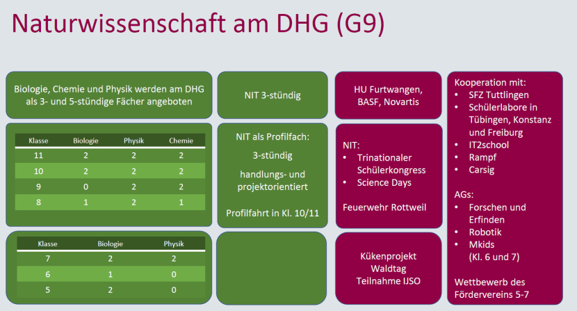 In der Kursstufe (Klassen 12 und 13) werden die Naturwissenschaften Biologie, Chemie und Physik sowohl als 3- als auch als 5-stündiges Fach angeboten. Lehrplanergänzende Exkursionen, beispielsweise zu Praktika bei unserer Kooperationspartnerin, der Hochschule Furtwangen, in Schülerlabore von Universitäten in Tübingen, Konstanz und Freiburg oder zu großen Industriebetrieben wie BASF und Novartis, verknüpfen Theorie und Praxis anschaulich.
